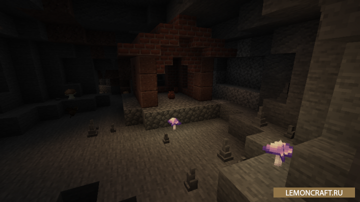 Мод на улучшенные подземелья Extended Caves внесет изменения в структуру подземелий, сделает их немного больше, а так же добавит небольшие заброшенные домики. Но самое интересное нововведение, это светящиеся грибы. Из данных грибов вы сможете создать еду, которая будет давать удивительный эффект для игрока. Так же в новых подземельях вы сможете встретить сталактиты, правда попадаются они очень редко.